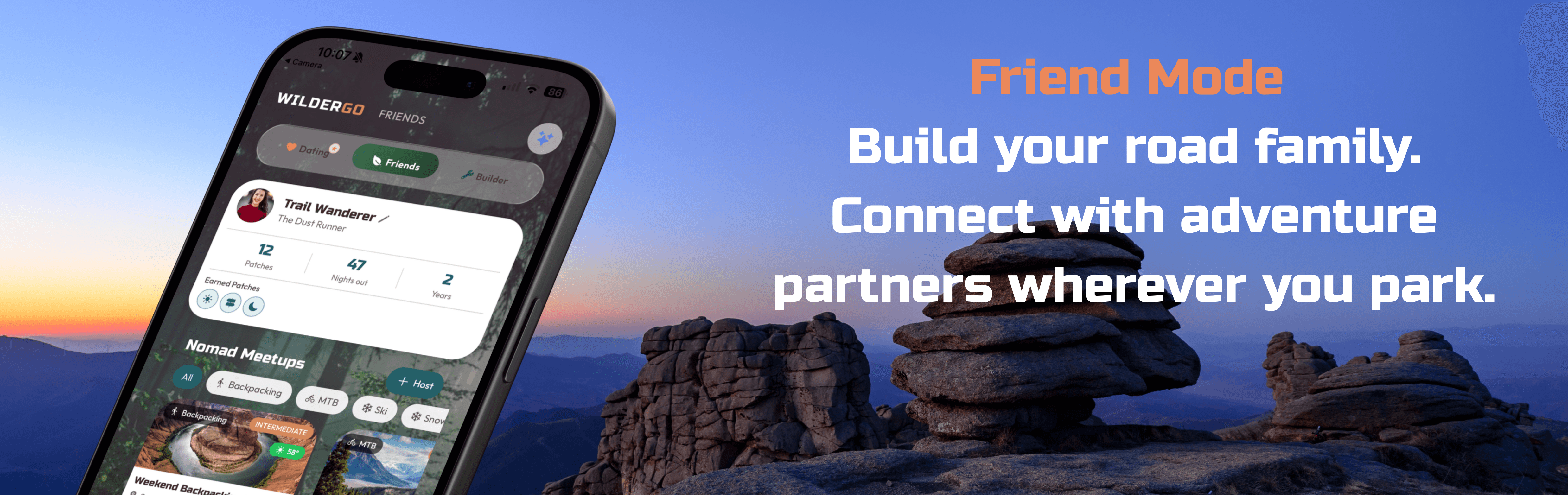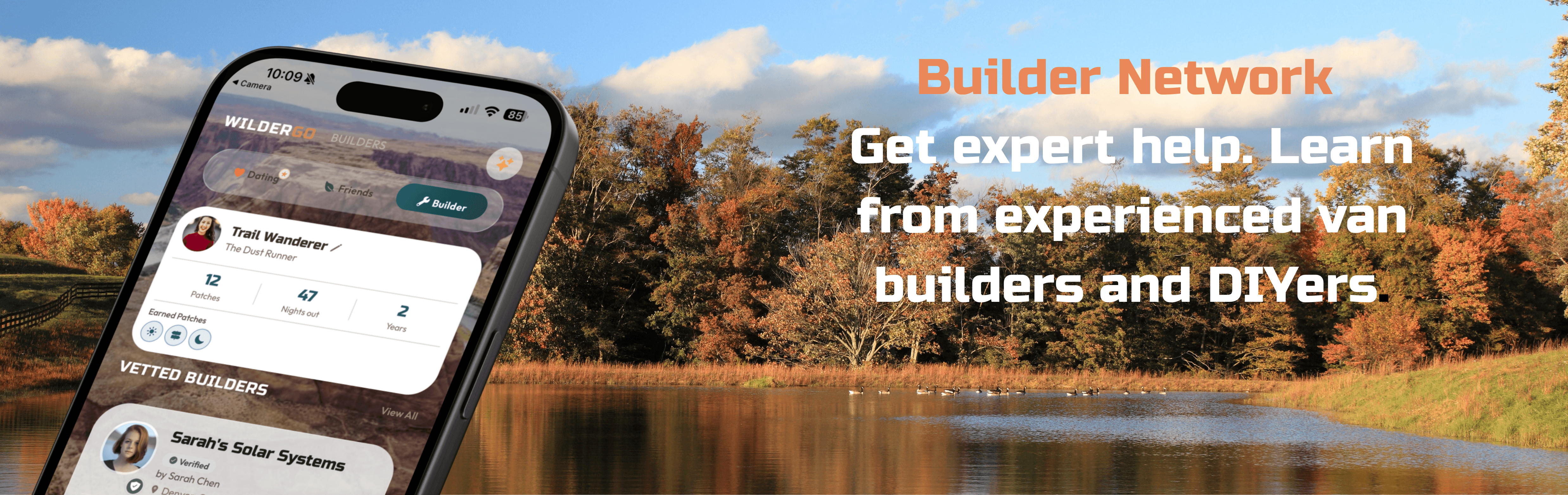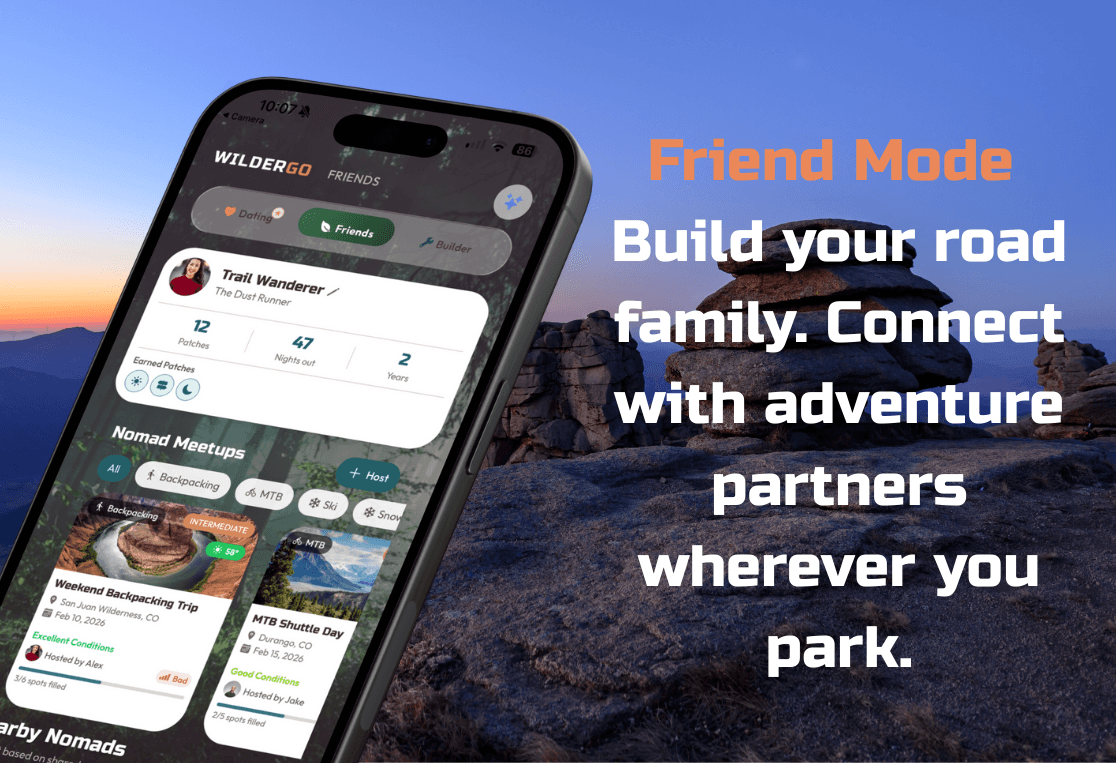 Whether you want to connect with other nomads out there or simply just make friends in the outdoor community. WilderGo is the place. The first all-in-one platform built exclusively for van lifers, RVers, and full-time travelers.